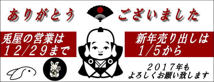 そんな弱小ショップの「兎屋」を応援して下さるお客様の事を考え、「ほぼ毎日紙バンド」のスタイルで過ごしてきた2016年も終わりに近づいています。14年よく続けて来たなぁ・・・・と言うのが率直な感想です。あと数日で今年も終わります。 商売下手の兎屋がヨロヨロ販売している兎屋商品をお買い上げ下さった皆様方「本当にありがとうございました。」そして来年もよろしくお願い致します。 兎屋/佐野