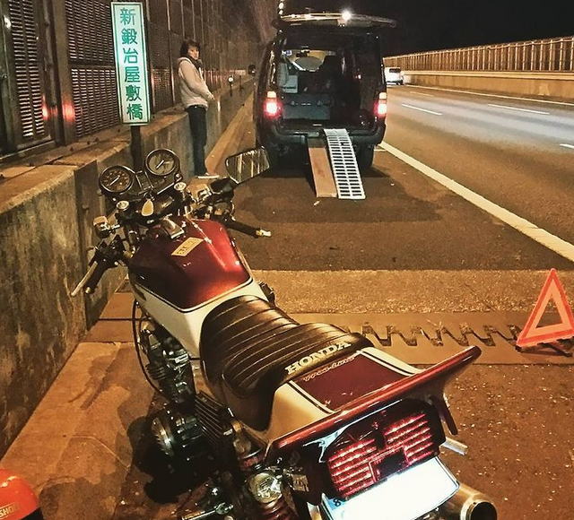 「あ俺、オートバイ故障して東名上りの都夫良野トンネル出口におるんやけど、迎えに来てくれませんか・・・・」という事で、車にラダーと歩み板とベルトを積んで出発(こんなことは私がいつもやらかしていたので慣れっこです)。新富士ICからぶっとばし、電話貰ってから1時間以内にはオートバイを回収していました。