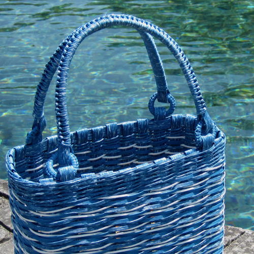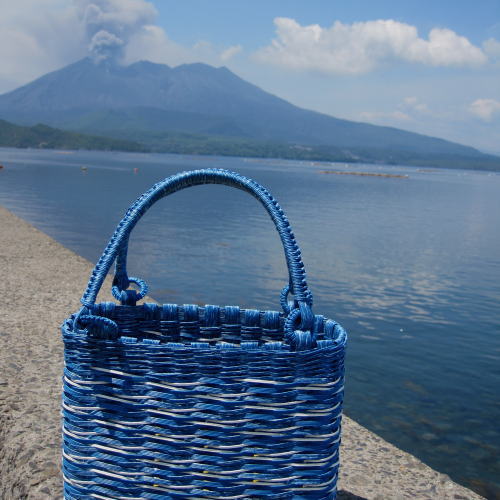 顔料墨流し紙バンド「しろ色×藍色」を使ったバッグの写真を、鹿児島県から送って頂きました。しかも迫力の桜島画像付きです!