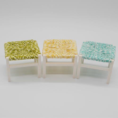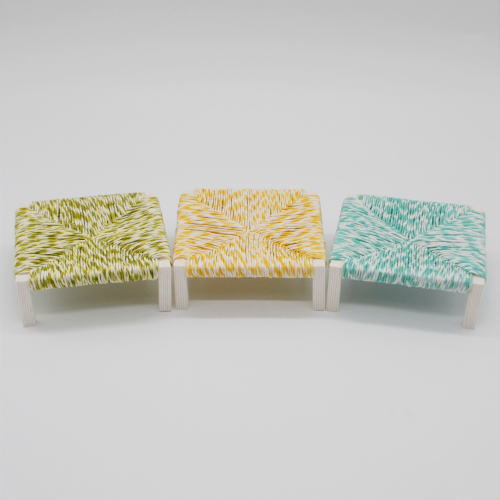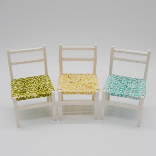 昨年発売したえべんこさんのキット「★★★結んでつくろう!紙糸ポーチ」に続いて第2弾が発売されました。今回のキットは「★★紙バンド&紙糸で作ろうミニチュアチェア」という事で、ミニサイズの椅子を作ります。椅子の形は3タイプ(背もたれあり・背もたれなし・短足台)となっています。