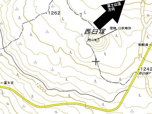 「・・・西臼塚は、富士宮口五合目へ上がっていく「富士山スカイライン」の途中にあり、五合目の約半分の高さ、標高1250m程の森の中に佇む、小さな側火山です。ここには、ブナ、ミズナラ、カエデなどの巨木が点在する落葉樹の森が広がり、家族や子供連れ等で、のんびりとピクニックを楽しむのに最適です。起伏は緩やかで歩く距離も短かく、本格的な山歩きの装備や服装でなくとも、手軽にやさしく富士山腹の自然を楽しむことができるのが本コースの魅力です。・・・」西臼塚の森ピクニックコース/ハローナビしずおか 静岡県観光情報から抜粋