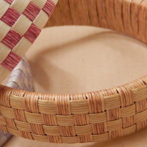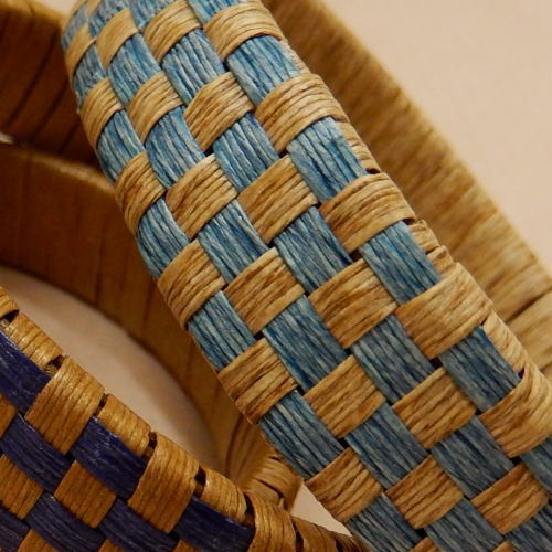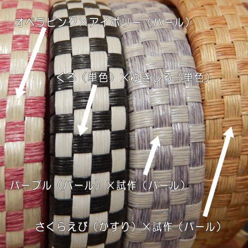 参考にしているのは ラウハラ編み で、本来の植物素材の代わりに、ゴクボソ紙バンドや、ゴクボソブレード を使用しています。