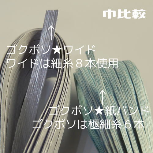 2020年春にテスト販売をしたゴクボソ紙バンドの幅広版です。通常のゴクボソに使用の極細糸より少し太めの糸を8本使っています。糸数を増やし幅広で厚みも少し増えています。…厚みプラスは約0.2mm…