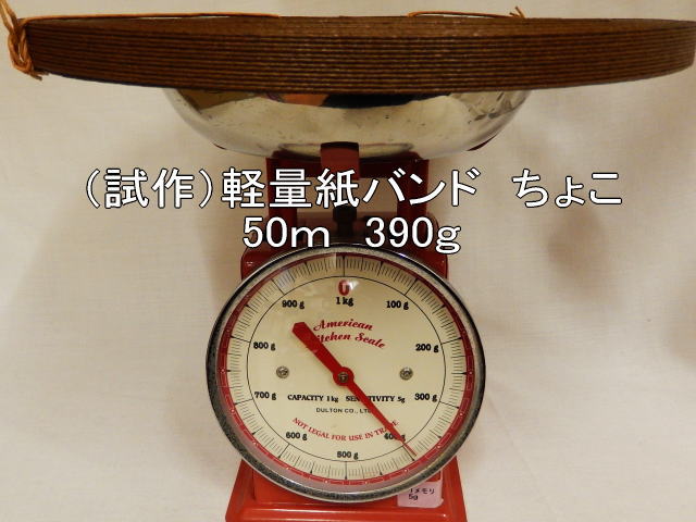 兎屋コレクションカラーと同じく、試作の軽量紙バンドも高知県原紙と愛媛県紙加工のいつもの組み合わせです。今回は紙の方をいじって見ました。出来上がった感じは、普通の紙バンドですが、持って見るとすぐに違いがわかります。とにかく