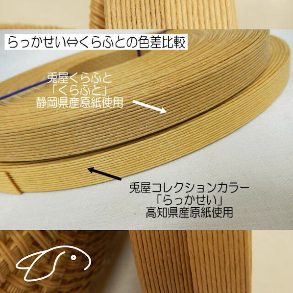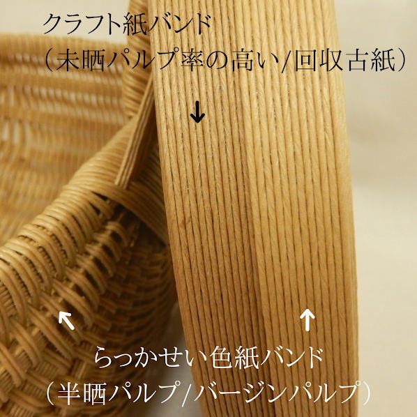 で、今回手に入れたかごに使用している兎屋コレクションカラー紙バンド「らっかせい」ですが、この紙バンドに使われているパルプは①でも②でもありません。実は第3のパルプ(ちょっと大袈裟な説明ですね)で、①と②の中間の(晒し工程に調整を加えた)パルプ=半晒パルプを使用しています。