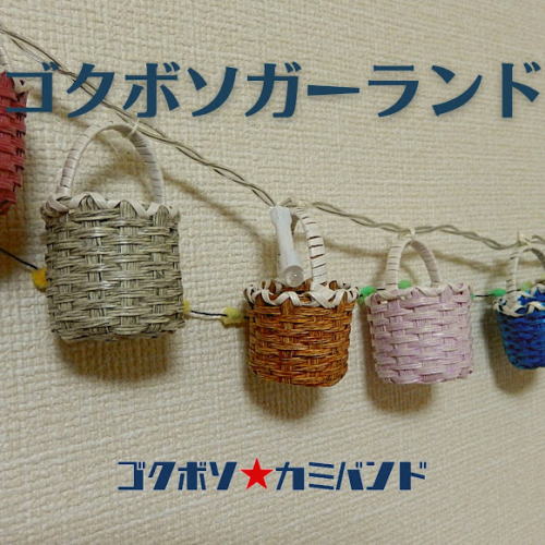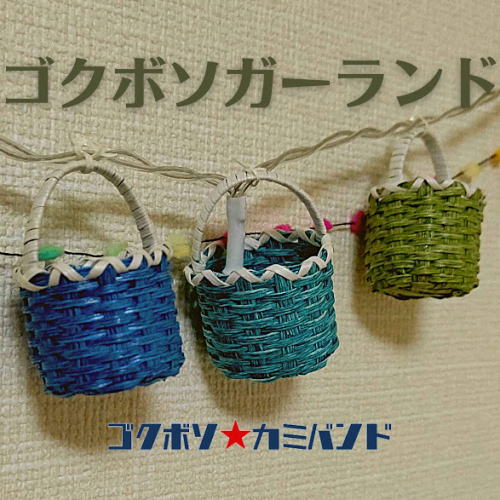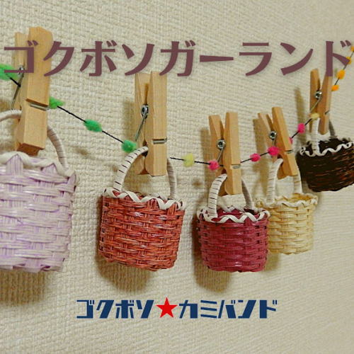 ゴクボソ紙バンド(極細糸6本)で作ったミニかごをガーランドにしてみました。