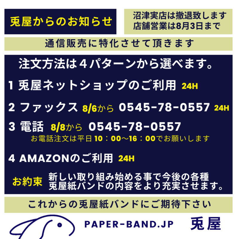 どうか諸々ご理解頂き、引き続き通信販売での兎屋紙バンドご購入をお願い致します。
