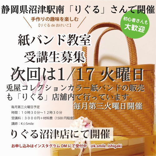 JR沼津駅南口から歩いて3分のところにある、和風雑貨店「りぐる」さんで開催中の「紙バンド手芸教室」のご案内です。
