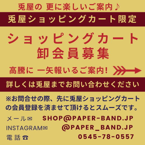 2023年3月17日 57usagi 紙バンド手芸講師・グループ代表様へのご案内 兎屋紙バンドでは「ショッピングカートの卸会員」様を募集しています。この機会に是非兎屋紙バンドを使って見てはいかがでしょう♪ 尚、お得な卸会員特典は兎屋ショッピングカート限定となっています事はご了承置き下さい。★様々な紙バンドを講習会等に取り入れる事で、①材料選びがより楽しくなり、②紙バンド講習会が賑やかになると共に、③作品の出来栄えが一層多彩になります。つまり兎屋のショッピングカートの会員になる事は、良い事沢山です♪★兎屋紙バンドに興味の御座います方は、この機会に兎屋紙バンドの「ショッピングカート 卸会員」にご登録して見て下さい。ご連絡お待ちしています。★詳しくは兎屋までお問い合わせください。ご説明差し上げます。損はさせませんよ♪※お問合せの際、 先に兎屋ショッピングカート の会員登録を済ませて頂けるとスムーズです。メール shop@paper-band.jpinstagram @paper_band.jp電話 0545-78-0557【主な卸会員条件のまとめ】※兎屋SCからのお買い上げ限定です。※一定金額以上のお買い上げに対して自動計算による割引をさせて頂きます。※10ヶ月以上お買い上げが無い場合は一般会員に変更させて頂きます。※↑再度卸会員に復活希望の際は、お問い合わせ下されば対応致します。……………☆……………@paper_band.jp#兎屋 #paper_band#paperband #papier#コレクションカラー紙バンド#ゴクボソ紙バンド #ゴクボソブレード#顔料墨流し紙バンド#ぺったんこ紙バンド#紙バンド#紙バンド手芸#クラフトバンド#手芸材料 #クラフトペーパー#japanpaper#高知県 #高知県原紙 #高知県紙加工#愛媛県 #愛媛県原紙 #愛媛県紙加工#静岡県 #静岡県原紙 #静岡県紙加工 共有: クリックして X で共有 (新しいウィンドウで開きます) X Facebook で共有するにはクリックしてください (新しいウィンドウで開きます) Facebook いいね 読み込み中… 関連