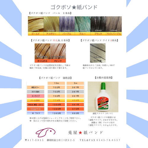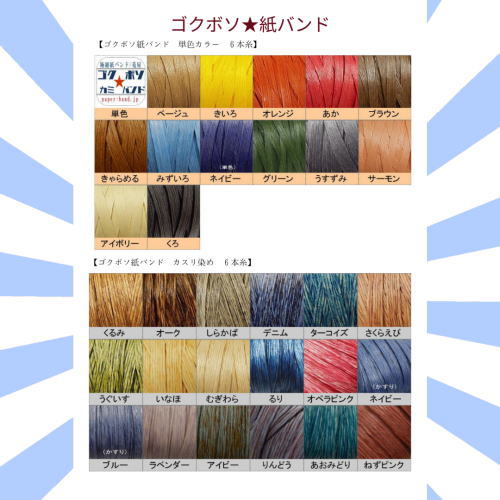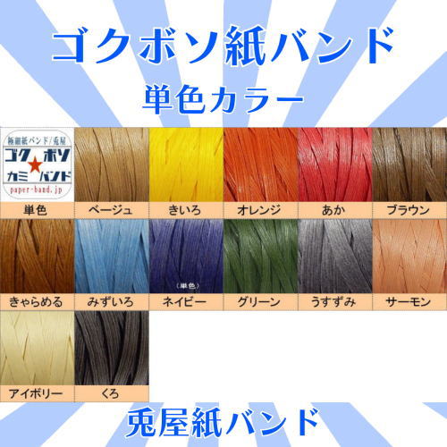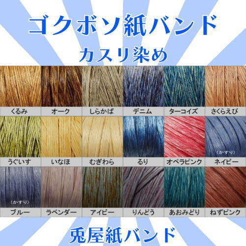 ゴクボソ紙バンドは数年の開発期間を経て、2018年夏から販売している、兎屋のオリジナル紙バンドで、細糸を6本並べた極めて薄くて細い紙バンドの事です。アクセサリーなど繊細な作品作りに適しています。(山本めぐみさんは、ゴクボソ紙バンドでバッグレシピを考えられました)