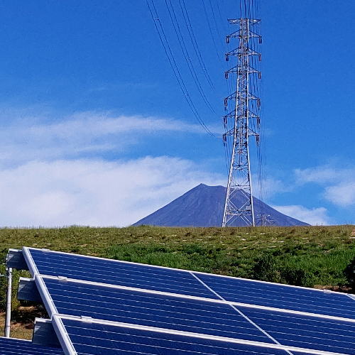 お彼岸が終わって少しは涼しくなった富士市からの撮影です。手前から「ソーラーパネル」「第二東名高速道路の土手」「高圧電線 鉄塔」「富士山」「青い空」の順となっています。現代日本の風景です。ww