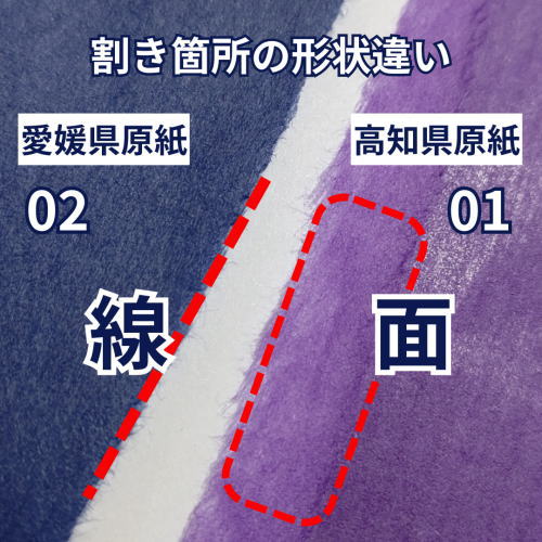02:愛媛県原紙→短繊維がきれいな割き(線)のためサクサク割けます。短い繊維なのでコントロールも容易で抄き方向に並び易い反面、繊維絡みが単純。抵抗もそこそこに真面目で良い子の愛媛気質?いろんな用途に使えます。