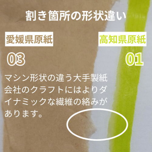 ※2枚目写真の03愛媛県原紙とは、大手製紙会社が抄造する両更クラフト紙と呼ばれる紙で、主に米麦袋やセメント袋などに使用される紙です。紙バンドや紙ひも用とは違い、紙の表面紙力(紙の破裂度)が求められます。その為繊維は長く、絡みもすごいですが、紙バンドには使用出来ません。