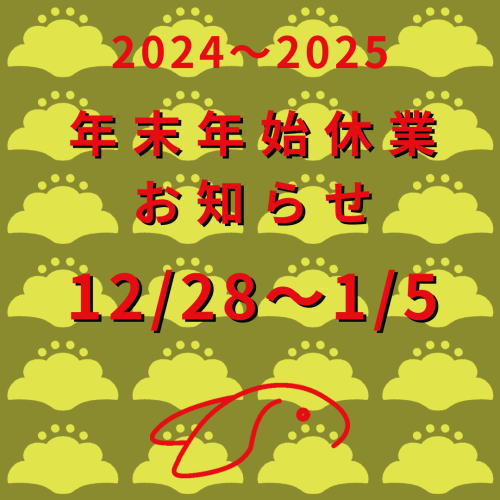 2024年12月21日 57usagi 【年末年始休業のお知らせ】 年末~年始の兎屋紙バンド休業日は、下記の通りとさせて頂きますので、宜しくお願いいたします。 12月28日(土)~1月5日(日)…休業 ※1月6日(月)より通常営業致します。※12月23日~1月14日は冬のセール開催します。※セール期間中は早めの出荷を心がけます。※休業中ショッピングカートは稼働します。※休業中でも佐川急便営業中は出荷します。 @paper_band.jp#兎屋#紙バンド#paperband 共有: クリックして X で共有 (新しいウィンドウで開きます) X Facebook で共有するにはクリックしてください (新しいウィンドウで開きます) Facebook いいね 読み込み中… 関連