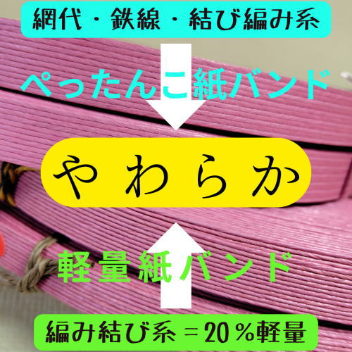 あれっ?兎屋的には「ぺったんこ紙バンド」は網代・鉄線向けだし、むしろ石畳編みなら「軽量紙バンド」だと思っていたので、目からウロコでした。