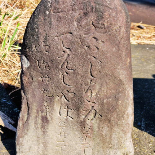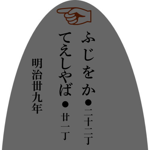 いつものウォーキングルートを遠回りして見つけた富士市間門(新東名高架真下)の坂道入口の道しるべ。富士・富士宮地区でよく見る道祖神や馬頭観音ではありません。方向手形がお遍路道のと同じです。ひらがなで「ふじをか・・・てえしやば」と刻まれています。